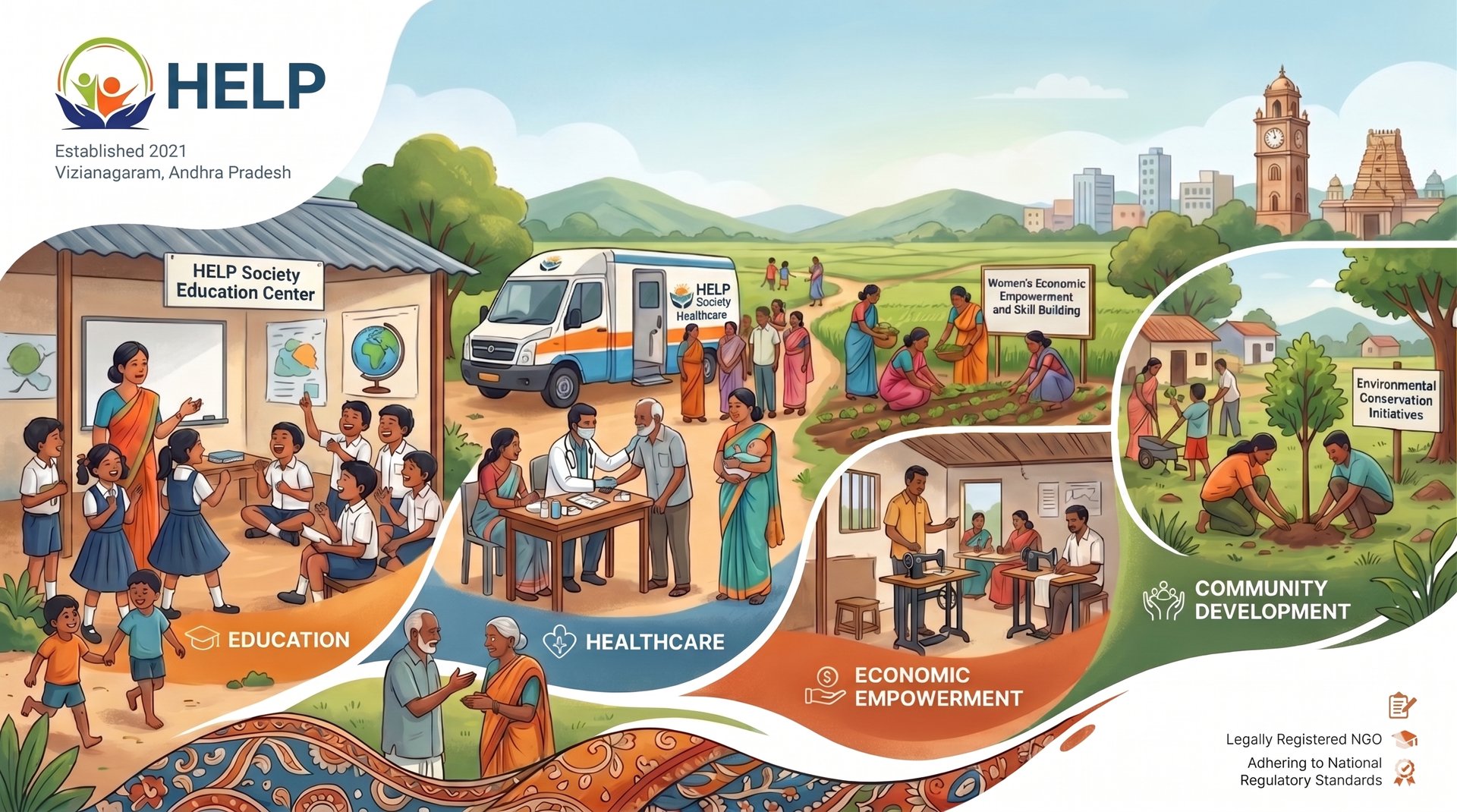HELP Society, based in Vizianagaram, is a non-profit organization dedicated to promoting social welfare and community development in the region. The society works across various sectors, including education, healthcare, livelihood enhancement, women empowerment, and environmental sustainability. Through its grassroots initiatives, HELP Society aims to uplift marginalized and underprivileged communities by providing them with the tools, resources, and support necessary to improve their quality of life. The organization also focuses on creating awareness, fostering skill development, and facilitating access to government schemes, thereby empowering individuals and groups to become self-reliant. With its strong network and commitment to sustainable development, HELP Society plays a pivotal role in transforming the lives of vulnerable populations in Vizianagaram and beyond.